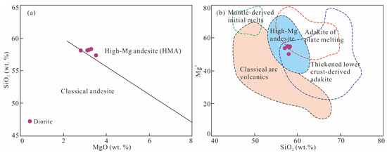 Diagrams of (a) SiO2 versus Mg# (modified after [107]) and (b) Ba versus Nb/Y (modified after [108]) of the diorites, showing the properties of high-Mg andesite.