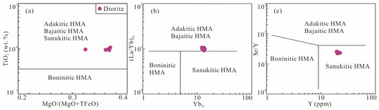 Diagrams of (a) MgO/(MgO+TFeO) versus TiO2 (modified after [109]), (b) YbN versus (La/Yb)N (modified after [112]) and (c) Y versus Sr/Y (modified after [114]) of the diorites, showing the classification of sanukitic HMA.