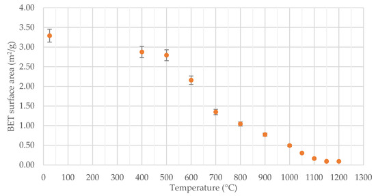 The surface area versus temperature plot of sintered LMS-1 simulant pellets is shown in Figure 1. Figure 1 shows surface areas calculated using BET analysis for sinter temperatures down to 400 °C as well as an unsintered feed material shown at 25 °C. A surface area reduction from 1.04 m2/g at 800 °C to 0.09 m2/g at 1150 °C was seen in samples. Minimal further surface area reduction was seen between 1150 and 1200 °C (<0.002 m2/g).