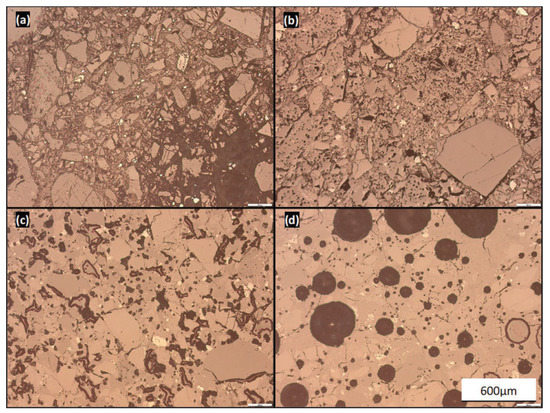 Micrographs of: (a) unsintered feed material, and sample cross-sections sintered for 2 h at: (b) 1100 °C, (c) 1150 °C, and (d) 1200 °C.