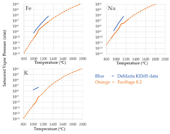Comparison between measured saturated vapor pressure of species Fe, Na, and K from De Maria et al. [15] shown in blue, and the prediction by FactSage 8.2 software shown in orange, given the Apollo sample #12022 feed shown in Table 1.