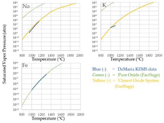 Comparison between measured saturated vapor pressure of species Fe, Na, and K from De Maria et al. [15] shown in blue, FactSage prediction assuming a pure oxide feed in green, and the closest oxide solution (FactSage) in yellow. The oxide systems represented by the yellow trend are Al2O3-CaO-Na2O, and Al2O3-K2O for Na and K, respectively.