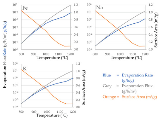 The predicted saturated vapor pressure of the species Fe, Na, and K between the temperatures of 800 °C and 1200 °C are shown in Table 2. Table 2 also shows the calculated evaporation flux in mol/s/m2 determined using the HKL equation given the predicted saturated pressures for each species. As described above, the saturated vapor pressure for Fe was predicted from an FeO system, Na from an Al2O3-CaO-Na2O system, and K from an Al2O3-K2O system.