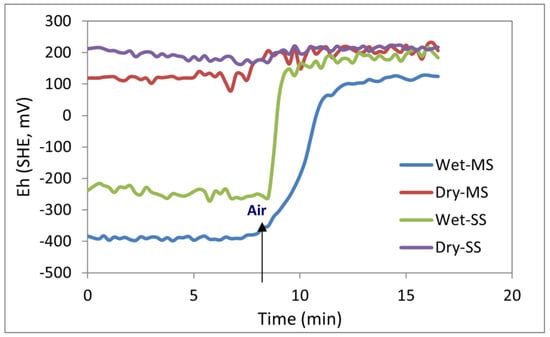 Variations in redox potential, dissolved oxygen and pH of the pulp were measured continuously during the flotation tests. Figure 1 illustrates the variations in redox potential of the pulp with the time for different grinding conditions. This graph represents the change in pulp potential in the system during flotation from the moment air is introduced to initiate flotation following conditioning. It is obvious that the wet-MS grinding process produced the lowest redox potential, as low as −400 mV. MS media decreased the pulp potential drastically due to the release of ferrous ions which in turn consumed all of the dissolved oxygen in the pulp. It is known that the optimum Eh value for collector adsorption ranges is between 0 to 200 mV for this sulphide type of ores. Increasing oxygen content in the pulp consumes the excess electrons and therefore increases the pulp potential. As a result of that, adsorption of thiol collector on sulphide minerals takes place at suitable pulp potential values. Therefore, it is not likely for the collectors to adsorb on the mineral surfaces until the potential reaches the suitable value. It is known that particularly in wet grinding conditions, oxygenation during conditioning and flotation is a significant parameter in the selective flotation of chalcopyrite from pyrite [20,21]. Introduction of air to the pulp at the beginning gradually increased the potential after 2–3 min of flotation, which affected the rate of flotation of copper minerals significantly. In wet grinding, the pulp potential increased from −400 mV to −200 mV by changing the medium from MS to SS, but it was observed that the potential still remained in the reducing condition, which was attributed to the galvanic interaction between chalcopyrite and pyrite. The dissolved oxygen was almost completely consumed in wet grinding by both grinding media. However, the presence of dissolved ferrous ions due to the galvanic interaction between the MS media and the sulphide minerals resulted in lower Eh. The redox potential of the dry ground ore, irrespective of the type of milling media, was measured considerably higher than the wet grinding conditions. In parallel to that, the DO concentrations were about 3–4 ppm in the beginning of the flotation. The absence of galvanic interaction in dry grinding affected the pulp chemistry considerably with both grinding media, and resulted in oxidizing pulp conditions. The higher redox potential and DO concentration enhanced the adsorption of collectors and flotation kinetics accordingly, as expected.