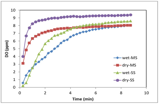 There is a close relationship between the rate of DO consumption, pulp redox potential and therefore flotation selectivity [7,10]. Figure 3 shows the DO measurements taken after introducing air at a 4 lt/min rate at every 15 s interval. The curves indicate a clear difference between the rate of increase in DO concentration and the grinding conditions. The lowest rate was obtained with wet-MS grinding and the highest rate with dry-SS milling. Under wet milling conditions, the DO concentration appeared to increase gradually in the pulp and stabilized at around 7–8 ppm. However, in dry grinding conditions, DO concentration increased with an instant increase and remained stable around 9 ppm, especially in the use of SS media. It can be seen that the shapes of the curves in Figure 3 are quite similar to the metal recovery curves. Therefore, the rate of increase in DO concentration was calculated using the following equation: