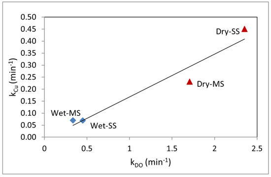 Figure 4 shows the relationship between the flotation rate constant of copper (kCu) and DO rate constant. There is a linear relationship between the two parameters, showing the dependence of flotation on the DO consumption of the ore.
