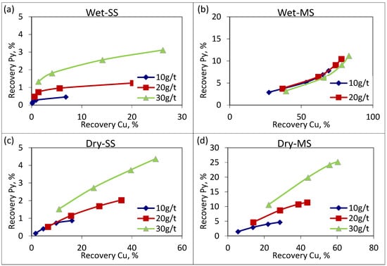 Pyrite vs. copper recovery in flotation after milling conditions of (a) Wet-SS (b) Wet-MS (c) Dry-SS (d) Dry-MS.