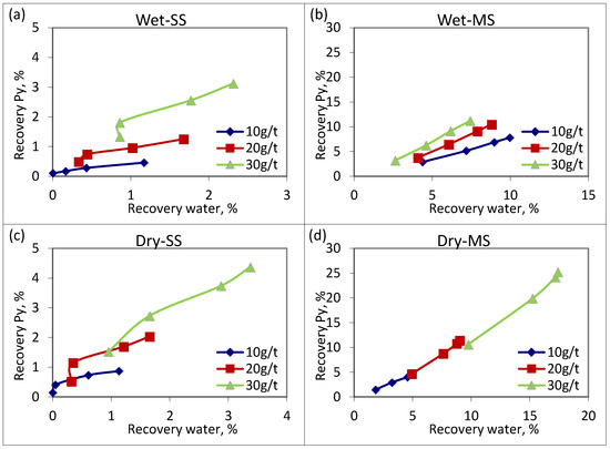 Pyrite vs. water recovery in flotation after milling conditions of (a) Wet-SS (b) Wet-MS (c) Dry-SS (d) Dry-MS.