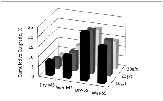 The wet grinding condition with MS balls provided higher Cu recoveries in copper flotation (Figure 6). Although the copper flotation efficiency was very low in the experiments with SS balls, it was observed that the highest Cu concentrate grade was obtained under these conditions (Figure 9). After grinding with SS balls, the stability of the froth was very low and the chemical conditions were suitable for chalcopyrite flotation. However, the flotation efficiency was very low due to the very high hydrophobic particles making the froth extremely brittle and unstable. Therefore, in copper flotation after grinding with SS balls, a more selective concentrate in terms of Cu grade could be obtained.