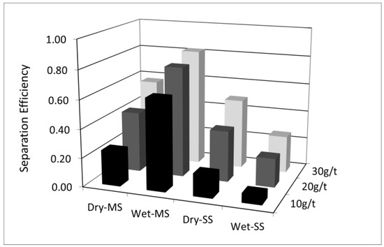 The calculated separation efficiency values for different milling conditions and the collector dosages are plotted in Figure 10. It is seen that the highest separation efficiency in terms of recovery and grade value was obtained in the wet grinding condition made with MS balls. In any case, the separation efficiency increased with the increase in the collector dosage.