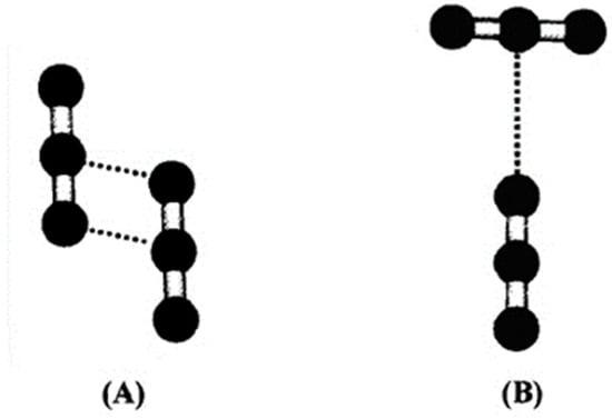 In a slipped-parallel structure, a hydrogen bond is established between the central Carbon atom of one molecule and one Oxygen of the coordinated molecule, while the Carbon of the second molecule binds the second Oxygen of the first molecule (Figure 4A). This configuration prevails mostly in the gas phase []; its prevalence decreases with growing pressure, becoming minor in the liquid and supercritical phases [], where the T-shape configuration prevails (Figure 4B). In this configuration, the axis of the two binding molecules forms a 90° angle, lying on the same plane, and the oxygen of one molecule binds the central carbon of the other molecule.