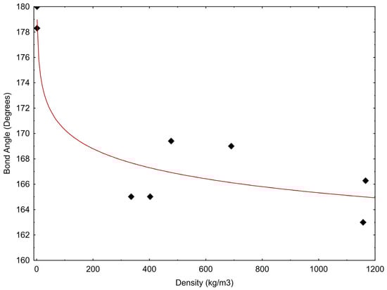 The correlation between bond angle and density is presented in Figure 5 and may be described by the following equation: