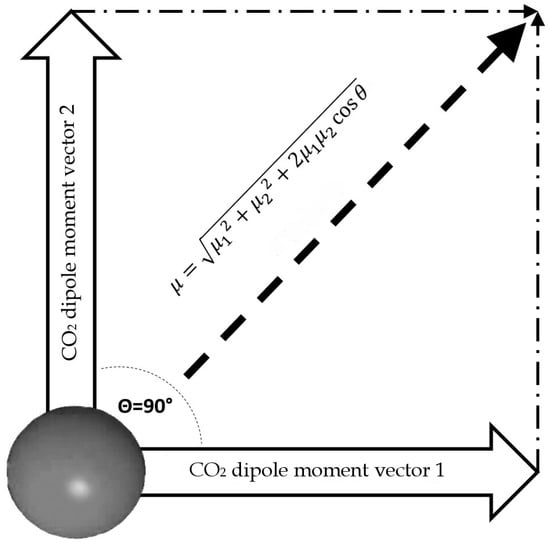In the CO2 molecule, the two C=O bonds have a length of 116.21 pm (NIST data), resulting in a significant opposite charge separation and a consequent dipole moment within each bond. Due to the fact that the molecule has a linear geometry, the entire molecule CO2 has a zero total dipole moment, and the two opposite partial-moment vectors nullify each other (Figure 2). However, at a molecular scale, the two dipole moments give the molecule a quadrupole moment that causes a noticeable solvation capability by means of quadrupole–dipole and quadrupole-induced dipole interactions [].