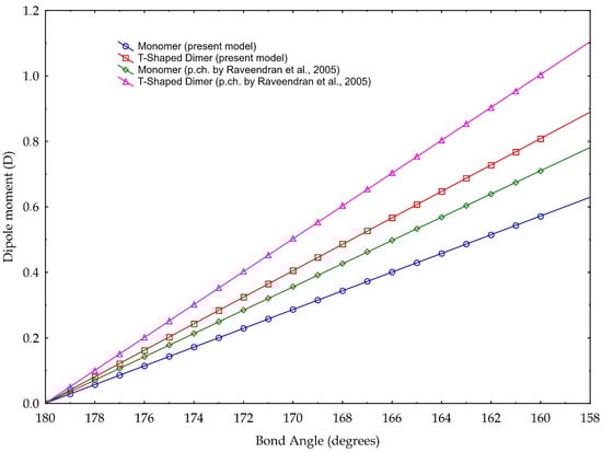 Given the relation between the density, the OCO angle and the dipole moment, Saharay and Balasubramanian [] indirectly fixed the highest density limit for the dipole moment to occur. In an ab initio MD study, they found that, close to the 1400 kg/m3 density value (not shown in the upper figures), the polarisation starts to nullify because of the structure of the first shell solvation. A total of 12 CO2 molecules spherically surrounded a central one and disposed again in a slipped-parallel configuration. So, at this extreme density value, no dipole moment exists, because every molecule has a planar configuration.