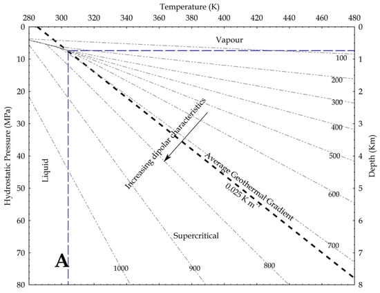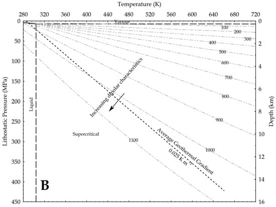 Density of CO2 in upper crust in a pressure versus temperature diagram that includes the CO2 phase diagram. In the graph, density values are in kg/m3; average geothermal gradient is 0.025 K/m; arrows point toward conditions in the Earth crust where CO2 is supposed to be more reactive due to a higher dipole moment. (A) depths are based on the H2O hydrostatic pressure; (B) depths are based on a lithostatic pressure.
