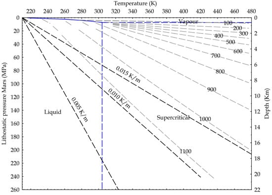 Martian crustal profile and CO2 state diagram. Three possible thermal gradients from 0.005 K/m to 0.015 K/m; lithostatic pressure calculated on basalts (3100 kg/m3) and Martian gravity acceleration (3.711 m/s2). Density isolines are indicated, calculated from NIST data.