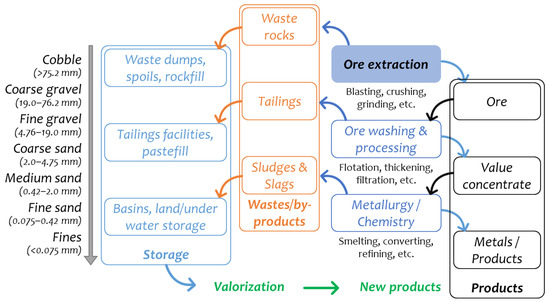 Mining activities are economically essential; however, as they are a major cause of pollution worldwide, they need to be conducted in a more ecological manner. This industry possesses several environmental challenges, yet the management of solid wastes generated during the lifetime of the mine is of major concern. Mining industries have storage issues in terms of space and risk of pollution. Indeed, ongoing monitoring is required for stability (risk of a landslide) and potentially hazardous elements (acidification and heavy metals). Leaching and washing erosion phenomenon of fine particles during rain periods are the main sources of contamination [1]. For waste management, the use of solidification/stabilization (S/S) techniques (e.g., cement paste tailings) is occasionally applied in road construction with physio-chemical stability benefits. It improves physio-chemical and environmental properties, immobilizing problematic elements and limiting the leaching potential (sulfides, heavy metals, or potential mineral swelling) in a cementitious matrix. For industrial minerals, the cost of waste management seldom exceeds 2% of the mineral’s sale value. In the UK, the costs of wastes from underground coal mines are nearly 3.5% [2]. The types of waste can be defined according to the stage of the ore extraction process and the waste characteristics (Figure 1). In line with the Bureau of Geological and Mining Research report on “management of mining, quarrying and ore-processing waste in the European Union,” generated mining wastes include topsoil, overburden, and waste rock [3]. In the USA only ~20% of abandoned mining sites have rehabilitation plans [4].