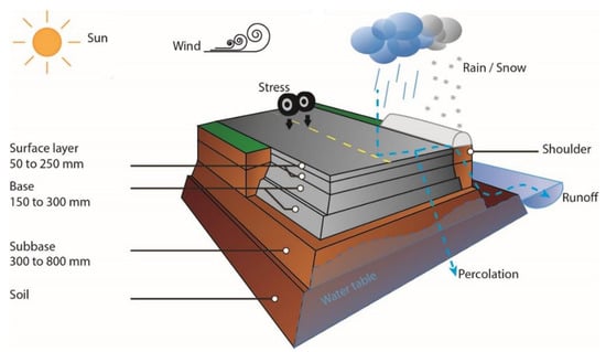 Roads are under the stresses of traffic, climatic variations (precipitation, variation of the groundwater level, freeze-thaw cycles), and natural soil variability (presence of clay, fine content, etc.). Depending on the geographic situation of aggregate demand and supply, compromises must be made between the different levels of requirements. Depending on expected traffic (load and frequency), the in-place soil-bearing capacity (strong or poor), and climatic regions, the total road depth structure can vary from 30 cm to more than 1 m. As a function of the selected technology, a road is usually composed of soil and three layers composed of 90% aggregate (Figure 2).