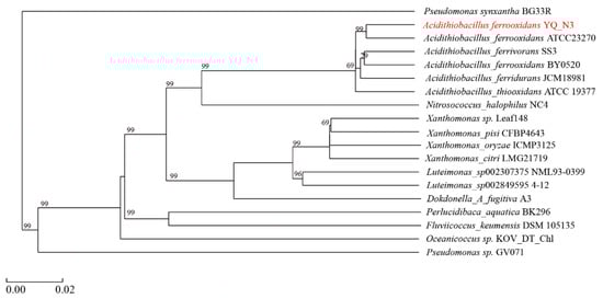 Upon comparing the 16S rRNA sequences in the GenBank database, the 18 strains that were closest at the species level were selected, and the NJ method was used to construct the phylogenetic tree of A. ferrooxidans YQ-N3 using the MEGA 6.0 software, as shown in Figure 2. The phylogenetic tree analyses demonstrated that A. ferrooxidans YQ-N3 was distinct from Pseudomonas, Oceanicoccus, Luteimonas, and Xanthomonas, but appeared to be related to A. thiooxidans, A. ferridurans, and A. ferrivorans. Particularly, the 16S rDNA sequence of A. ferrooxidans YQ-N3 was more than 99.93% similar to that of A. ferrooxidans ATCC23270, and it was therefore concluded that the isolated strains were A. ferrooxidans.