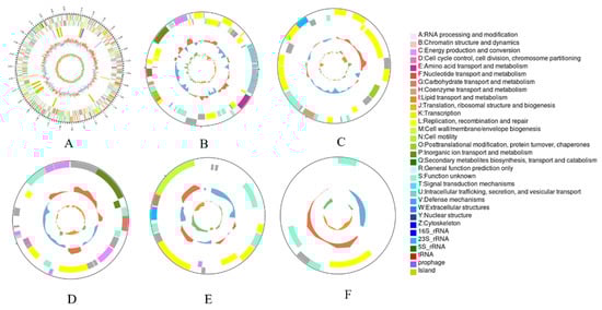 Circular genome map of A. ferrooxidans YQ-N3. From outside to center: genes on the direct strand, genes on the complementary strand, tRNAs (orange), rRNA (purple), CRISPR (blue), and genomic island (green). GC-skew and sequencing depths are also displayed. (A) Chromosome, (B) Plasmid A, (C) Plasmid B, (D) Plasmid C, (E) Plasmid D, and (F) Plasmid E.