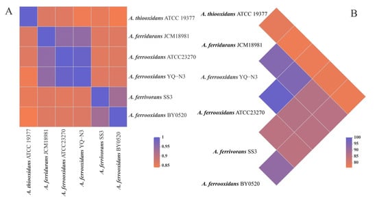 A summary of the features of six selected genomes is listed in Table 4. These strains were collected from different environments around the world but mainly from acid mine drainage. These genomes vary in size by approximately 0.44 Mb (ranging from 2.98 to 3.42 Mb) with coding sequence (CDS) numbers ranging from 2927 to 3498 and the G+C contents of the genomes ranging from 53% to 58.8%. Figure 4 shows the results of ANI and AAI analysis among strains. The squares with different colors show the similarity of nucleotides and amino acids among stains. It can be seen that A. ferrooxidans YQ-N3 is closely related to A. ferrooxidans ATCC23270 and A. ferridurans JCM18981. The ANI value and AAI value between A. ferrooxidans YQ-N3 and A. ferrooxidans ATCC23270 exceeded 95%, indicating that A. ferrooxidans YQ-N3 and A. ferrooxidans ATCC23270 are the same species. The results of the whole genome alignment between A. ferrooxidans YQ-N3 and the selected genomes are shown in Figure 5. Our findings indicated that the genomic arrangement of A. ferrooxidans YQ-N3 has the best co-linearity with A. ferrooxidans ATCC23270, and has better co-linearity with A. ferridurans JCM18981 than with A. ferrooxidans BY0502. This result demonstrates that A. ferrooxidans YQ-N3 and A. ferrooxidans ATCC23270 have closer evolutionary distances and highlights the abundant evolutionary progress of A. ferrooxidans.