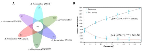 To further examine the genomic characteristics of A. ferrooxidans YQ-N3, the genomes of five strains closest to it at the species level based on 16S rRNA sequences were selected for comparative analysis. The genome sequences of the selected strains (A. ferrooxidans ATCC23270, A. ferrooxidans BY0502, A. ferridurans JCM18981, A. thiooxidans ATCC 19377, and A. ferrivorans SS3) were obtained from the GenBank database. Glimmer 3.0 (http://ccb.jhu.edu/software/glimmer/index.shtml (accessed on 4 January 2023)) and GeneMarkS (Predictive Plasmid Genome) software (Version 4.3, http://topaz.gatech.edu/GeneMark (accessed on 4 January 2023)) were used to predict the coding sequence (CDS) of genome. The core gene and pan-genome in the predicted sequence were analyzed using BPGA (Bacterial Pan-genome Analysis tool ver. 1.2, https://iicb.res.in/bpga/index.html (accessed on 4 January 2023)). The empirical power law equation and exponential equation were used to calculate the extrapolation of the pan-genome and core genome curves, respectively [18,19]. ANI analysis of the selected genome was conducted by using the pyani software following the ANIm method. AAI analysis of the selected genome was performed using the CompareM software (https://github.com/dparks1134/CompareM (accessed on 4 January 2023)). Genome alignments between A. ferrooxidans YQ-N3 and A. ferrooxidans ATCC23270, A. ferrooxidans BY0502, A. ferridurans JCM18981, A. thiooxidans ATCC 19377, and A. ferrivorans SS3 were conducted using the MUMmer software (ver. 3.23, https://sourceforge.net/projects/mummer/files/latest/download (accessed on 4 January 2023)) related to the ucmer comparison method. Based on protein sequence alignments, the coding genes predicted on the A. ferrooxidans YQ-N3 and the genome of the other five studied strains were compared with the COG (clusters of orthologous groups of proteins) databases for functional annotation, and the corresponding functional annotations were obtained.