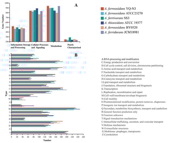 Figure 7 shows the COG annotation category and function statistics of the studied strains. These COGs were divided into four categories and 24 functional classes. The proportion of genes related to replication, recombination, and repair (L), cell wall/membrane/envelope biogenesis (M), energy production and conversion (C), and inorganic ion transport and metabolism (P) was slightly higher than that of genes with other functions, accounting for 5.55%–7.18%, 8.16%–9.71%, 6.66%–7.58%, and 5.55%–6.89% of all annotated genes, respectively. Additionally, defense mechanisms accounted for 4.92%–5.91% of all annotated genes, suggesting that these strains have a strong ability to self-repair and resist harsh environments [1]. A. ferrooxidans YQ-N3 has a total of 2571 genes annotated in COG, accounting for approximately 80.34% of the total number of genes. Compared to other strains, A. ferrooxidans YQ-N3 had the most genes associated with functions supporting P, L, and J (translation, ribosomal structure, and biogenesis). Moreover, the distribution of functional genes in the A. ferrooxidans YQ-N3, A. ferrooxidans ATCC23270, and A. ferrooxidans BY0502 genomes showed a similar pattern.