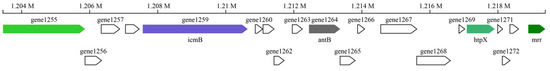 Linear map of genome islands. (The arrows represent genes, the length of the arrow represents the gene length, the direction indicates that the gene is encoded by a sense chain or antisense chain, and the color represents its COG function classification. The arrow without color represents that the corresponding COG function is not annotated. COG function classifications of gene 1252, gene 1259, gene 1264, htpX and mrr are type L, type S, type K, type O and type V).