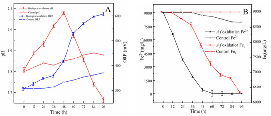 Trends of physicochemical indexes during Fe2+ oxidation by A. ferrooxidans YQ-N3.((A) is the change of pH and ORP; (B) is the change of content Fe2+ and total Fe. The error bar represents the standard deviation of three parallel experiments).