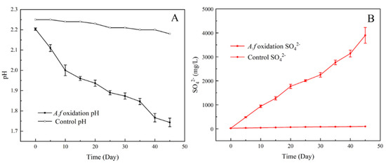 Trends of physicochemical indexes during S0 oxidation by A. ferrooxidans YQ-N3. ((A) is the change of pH; (B) is the change of content SO42-. The error bar represents the standard deviation of three parallel experiments).