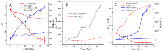 Trends of physicochemical indexes during FeS2 oxidation by A. ferrooxidans YQ-N3. ((A) is the change of pH and ORP; (B) is the change of content SO42-; (C) is the change of content Fe2+ and total Fe. The error bar represents the standard deviation of three parallel experiments).