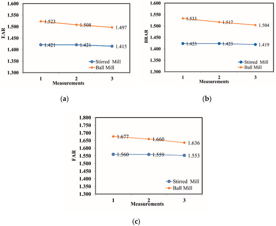 Figure 9 summarizes three different aspect ratio parameters, EAR, BRAR, and FAR, based on the bounding rectangle model, the Ellipse model, and the Feret model, as measured by DIA for Stirred mill and ball mill products, respectively. As seen from Figure 9a, EAR values ranged from 1.421 to 1.415 for stirred milled calcite particles, while they varied from 1.523 to 1.497 for ball milled particles. In addition, BRAR values ranged from 1.419 to 1.423 for stirred-milled calcite particles, whereas they varied from 1.504 to 1.533 for ball-milled particles (Figure 9b). Finally, FAR values ranged from 1.553 to 1.560 for stirred milled calcite particles; on the other hand, they varied between 1.636 to 1.677 for ball milled particles (Figure 9c). The same trend was found for all three different aspect ratio parameters measured for grains of calcite products ground in two different mills. Overall results revealed that the higher aspect ratio values were obtained by the ball mill compared to the stirred mill, indicating that the particles ground by stirred mill have lower elongated particles. The results have shown that every data point in the plots represents more than 10,000 counted particles measured by three consistent repetitions to provide high statistical accuracy since at least 6400 particles for each measurement are required at a 99% confidence level as stated by British Standard 3406 [48] and Allen [49]. Ulusoy and Yekeler [50] also measured EAR, BRAR, and FAR values for 0.250 + 0.045 μm ball milled calcite as 1.664, 1.665, and 1.765, respectively. The differences in the results of the two different studies are attributed to the particle size and purity of the calcite material used. It was concluded that ball milled particles had a higher aspect ratio in terms of the EAR, BRR, and FAR than stirred milled particles.