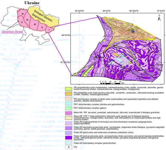 Regional position of Dibrova mineral deposit within the Ukrainian Shield. Schematic contours of Ukraine (left) with the Ukrainian Shield scheme (in magenta). Numbers represent the megablocks of the Ukrainian Shield: I—Azov Megablock, II—Middle-Dnipro Megablock, III—Kirovohrad Megablock; IV—Ros-Tykych Megablock; V—Podilsky Megablock; VI—Volyn Megablock. Blow-up figure shows the geology of the West Azov Megablock in details (modified from [8]); the zone in transparent yellow shows the extends of Vovchansky Block (modified from [8]). Blue star marks the location of Dibrova mineral deposit. Abbreviations: AR = Archean; PR = Proterozoic.