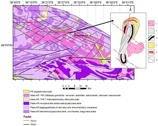 Geological setting of the Dibrova mineral deposit with the close-up to the schematic map of the mineral deposit (modified from [8,9]). 1—two-feldspar granitoids (biotite and muscovite-rich); 2—aluminosilicate and ferruginous schists and crystalline schists (biotite, amphibole-biotite, magnetite-cummingtonite-rich, etc.); 3—horizons of chemogenic iron-rich quartzites; 4—stratum of monoquartz and K-feldspar-bearing metasandstones, metagritstones, quartzites, with intercalations of metaconglomerates and high alumina shales; 5—stratiform U-Th-REE mineralization; 6—faults. Abbreviations: AR = Archean; PR = Proterozoic.