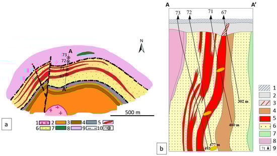 Dibrova mineral deposit: (a) Plan view (modified from [21]): 1—granites; 2—biotite and garnet-biotite gneisses; 3—garnet-biotite shale with magnetite; 4—garnet-amphibole-biotite shale; 5—ore zones in quartzites; 6—sillimanite-biotite, biotite, garnet-biotite, amphibole-biotite, muscovite, and fuchsite quartzites; 7—amphibolites; 8—biotite migmatite; 9—faults; 10—wells. (b) Cross-section (modified from [10]): 1—sedimentary cover; 2—weathered crust; 3—continuation of mineralization in the weathered crust; 4—garnet-quartz-amphibole-magnetite iron ore rocks; 5—mineralized zones; 6—apoconglomerate, apogritstones, apopsammite sillimanite-biotite, sillimanite-muscovite, and fuchsite quartzites with feldspars and pyrite; 7—amphibole-biotite schists; 8—biotite migmatite; 10—wells. Orange ovals mark the location of some of the studied samples.