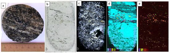 Garnet-biotite gneiss: (a) Sample 72-478 (drill-hole No. 72, depth—478 m)—biotite schist/gneiss; (b) Micro-XRF image (Si) (can serve as an equivalent to quartz) of the thin-section 72-478; (c) Micro-XRF image (Fe)—can serve as an equivalent to biotite; (d) Micro-XRF image (S)—can serve as an equivalent to sulfides; (e) Micro-XRF image (P)—can serve as an equivalent to monazite.