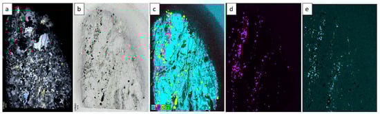Sample 71-204 (drill-hole No. 71, depth—204 m)—quartzite: (a) transmitted cross polarized light photomicrograph (XPL); (b) transmitted plane polarized light photomicrograph (PPL); (c) Micro-XRF image—Si, P, S, Ti; (d) Micro-XRF image—P—can serve as an equivalent to monazite; (e) Micro-XRF image—U. Mineral composition: quartz 85 vol.%; muscovite + sillimanite + feldspar 10 vol.%; ore minerals 5 vol.%. Note that the ore minerals are localized in the form of scattered grains in the grain interstices.