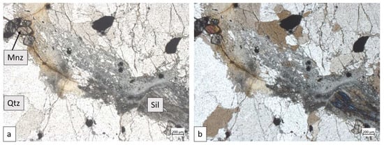 Sample 72-355: (a) transmitted plane polarized light photomicrograph (PPL); (b) transmitted cross polarized light photomicrograph (XPL). Abbreviations: Mnz = monazite, Sil = sillimanite, Qtz = quartz. Note that the ore minerals are associated with sillimanite and are localized in grain interstices and fracture zones.
