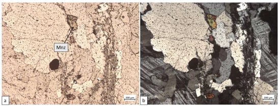 Monazite grains in pegmatoid. Sample 70-258 (mineralized pegmatoid): (a) transmitted plane polarized light photomicrograph (PPL); (b) transmitted cross polarized light photomicrograph (XPL). Abbreviations: Mnz = monazite.
