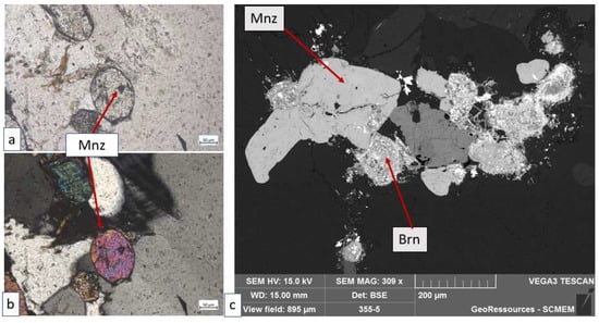 (a) Photomicrograph of mineralization in transmitted plane polarized light (PPL); (b) transmitted cross polarized light photomicrograph (XPL); (c) SEM-BSE image (sample 72-355). Abbreviations: Mnz = monazite, Brn = brannerite.