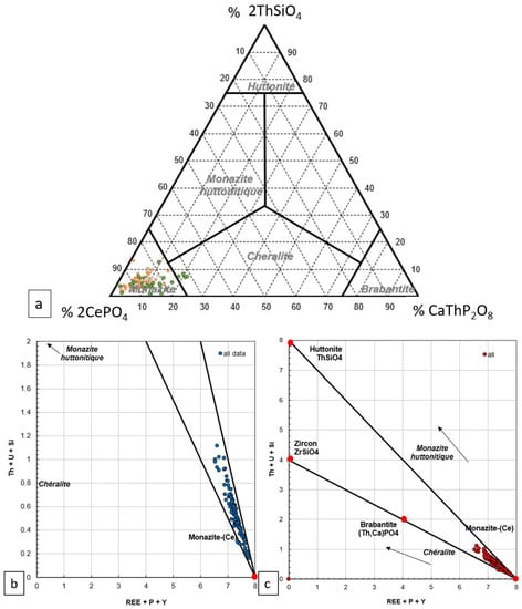 (a) Ternary plot of the monazite compositions (orange—quartzites, green—pegmatoid, grey—biotite schists); (b) Th + U + Si vs REE + Y + P diagram (all samples are displayed in blue (b) and red (c)). For the studied samples, the monazite grains are dominated by monazite-(Ce) compositions.