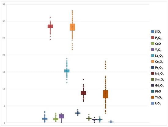 Box and whisker plots of main oxide concentrations (in wt.%) in monazites. Different colors represent different oxides (see legend to the left of the graph). Number of spots analyzed = 142, representing quartzite and pegmatoid samples.