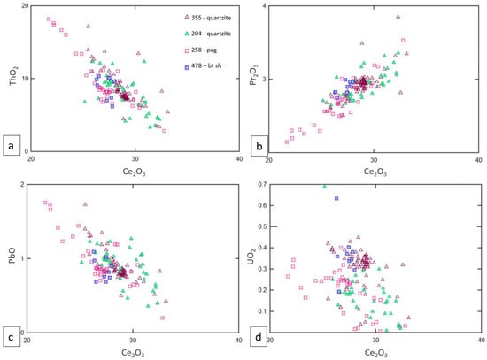 (a) ThO2 to Ce2O3 (in wt.%) graph—inverse correlation observed for all lithologies; (b) Pr2O3 to Ce2O3 (in wt.%) graph—direct correlation observed for all lithologies; (c) PbO to Ce2O3 (in wt.%) graph—inverse correlation observed for all lithologies; (d) UO2 to Ce2O3 (in wt.%) graph—no correlation to very weak inverse (355—quartzite sample, 204—quartzite sample, 258—pegmatoid sample, 478—biotite schist sample).