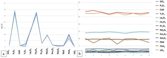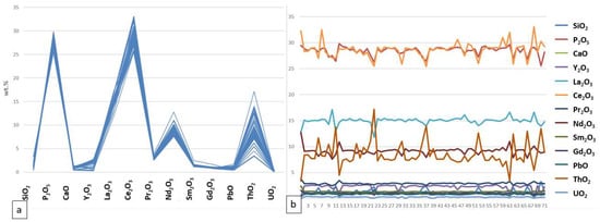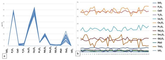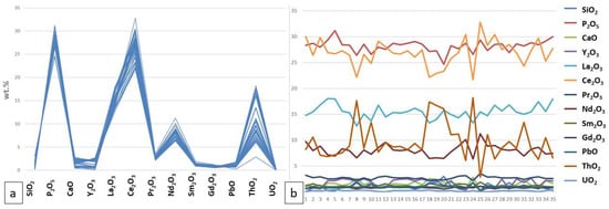 We have analyzed the monazite grains in each sample individually (Figure 16, Figure 17, Figure 18 and Figure 19: a—main oxide content distributions in wt.%, b—monazite main oxide concentrations (in wt.%) shown for each point analysis). Overall, we can see that there are no large differences between the oxide concentration patterns of the studied samples. However, we do see a spread in the concentration within each individual sample for such oxides as ThO2, Ce2O3, and Nd2O3.