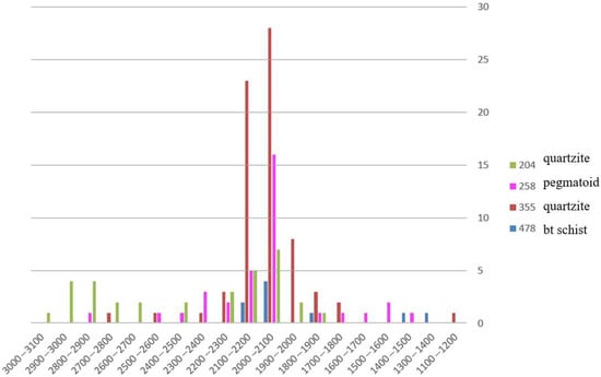 In this research, the chemical ages were calculated using the EPMA data and the procedures of [24,30,32]. Data are provided in the Supplementary Data (Table S1). The graphs in Figure 20 and Table 3 show the obtained chemical U-Th-Pb ages for monazites from all the studied rock types—quartzites, pegmatoid, and biotite schist. These ages can be interpreted as the age of the peak metamorphism/metasomatism, magmatic crystallization, and/or possible age of the source rock area. The majority of chemical ages (U-Th-Pb) calculated from monazite EMPA range between 2.2–2.0 Ga.