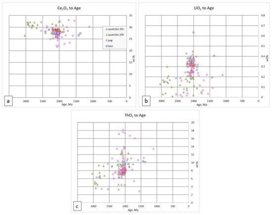 Monazites within the pegmatoid sample are unzoned, whereas in the quartzites they exhibit ill-developed or no zonation (Figure 12c). Lighter grey zones are characterized by higher Th and U contents and lower REE contents. The chemical composition of monazite is presented in the Supplementary Data (Table S1). A total of 151 spots have been analyzed: 107 spots in the monazite from quartzite samples (sample 355: 71 spots, sample 204: 36 spots), 35 spots in the monazite of pegmatoid sample (sample 258), and nine spots from the biotite schist/gneiss sample (sample 478). Sukach et al. and Kramar et al. [8,10] stated that monazite is a cheralite type; however, the chemical EPMA analyses that we have conducted reveal that for all the studied samples, regardless of the host rock type, the monazite grains are dominated by monazite-(Ce) compositions (Figure 13a,b).