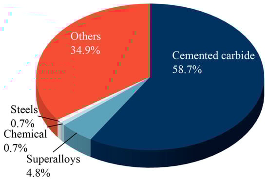 Tungsten is a critical metal resource used extensively in many industries, such as military, electronics, mining, and machinery [1,2]. The tungsten consumed in the U.S. for various end uses is shown graphically in Figure 1 [3]. By the end of 2022, the world’s tungsten ore reserves were approximately 3.7 million tons (Figure 2). Of these, China holds the largest tungsten reserves with 1.8 million tons, or approximately 47.8% of the total. Russia has 400,000 tons, which constitutes 10.6% of the total; Vietnam has 100,000 tons, or 2.7%; Spain has 56,000 tons, or 1.5%; Austria has 10,000 tons, or 0.3%; and Portugal has only 3100 tons, or 0.1%. Due to the increasing demand, the United States, the European Union, and several other countries have declared tungsten to be one of the most important raw materials [4,5,6,7].