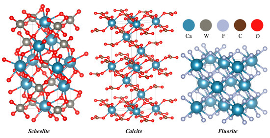 The main difficulty in the flotation of scheelite (CaWO4) lies in separating the calcium-bearing gangue minerals, which are mainly composed of calcite (CaCO3) and fluorite (CaF2). As shown in Figure 3, scheelite adopts a tetragonal crystal system with cell parameters a = b = 5.243 Å, c = 11.376 Å, α = β = γ = 90°, and space group I41/a. Calcite is a tripartite crystal system with a = b = 4.988 Å, c = 17.061 Å, α = β = 90°, γ = 120°, and space group R3c. Fluorite is a cubic crystal system with a = b = c = 5.46 Å, α = β = γ = 90°, and space group Fm3m [17].
