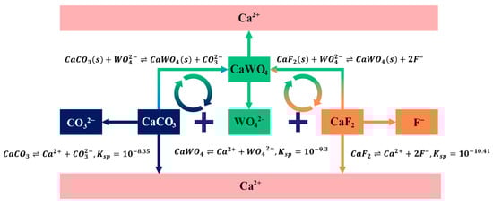 There are two main challenges in separating scheelite from calcium-bearing veinlets: their similar surface properties and dissolution transformations. Both minerals have Ca sites on their surfaces that act as collector and inhibitor sites during flotation. Furthermore, the high solubilities of scheelite, calcite, fluorite, and other calcium-bearing minerals lead to reactions and dissolution transformations in solution [18]. This further increases the similarities of the mineral surfaces [11,19]. Figure 4 shows the interconversion relationships among calcite, fluorite, and scheelite, which are based on the following reactions [18]: