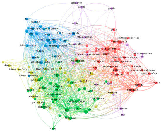 Keywords used in research on scheelite flotation in the Web of Science from 2014 to 2023 (Different clusters are represented by different colors).